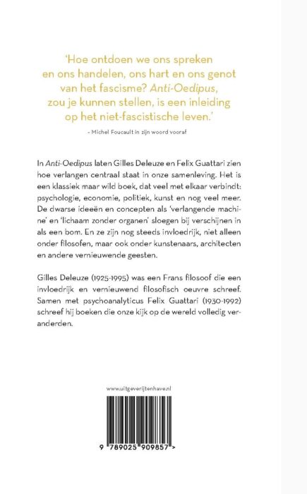 In ‘Anti-Oedipus’ laten Gilles Deleuze en Felix Guattari zien hoe verlangen centraal staat in onze samenleving. Het is een klassiek maar wild boek, dat veel met elkaar verbindt: psychologie, economie, politiek, kunst en nog veel meer. De dwarse ideeën en concepten als ‘verlangensmachine’ en ‘lichaam zonder organen’ sloegen bij verschijnen in als een bom. En ze zijn nog steeds invloedrijk, niet alleen onder filosofen, maar ook onder kunstenaars, architecten en andere vernieuwende geesten.