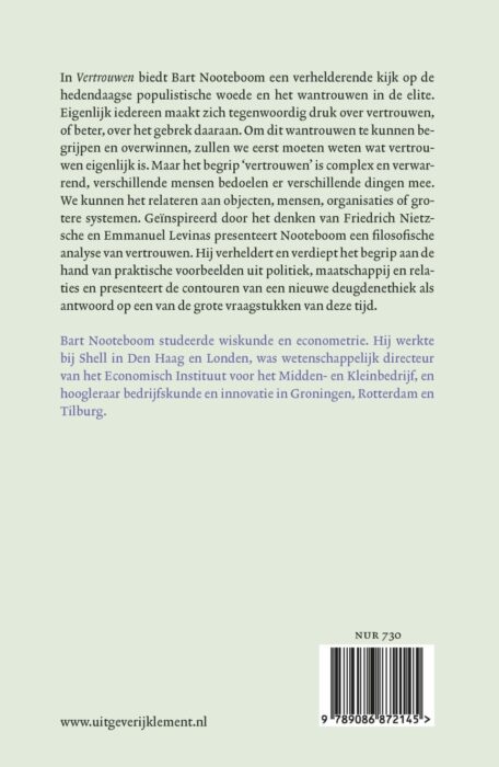 Met Vertrouwen verheldert en verdiept Bart Nooteboom het begrip 'vertrouwen' en laat hij zien hoe het kan functioneren als een mentale blikopener. Vertrouwen is als schone lucht: je praat er pas over als het er niet is. Iedereen maakt zich tegenwoordig druk over vertrouwen, of beter, over het gebrek daaraan. Maar het begrip 'vertrouwen' is complex en verwarrend. We kunnen het relateren aan objecten, mensen, organisaties of grotere systemen. Nooteboom laat zien hoe vertrouwen werkt in de politiek, in de maatschappij en in relaties.
